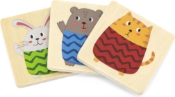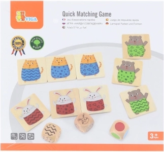 Schnelles Zuordnen aus Holz von VIGA ist ein Familienspiel, das Wahrnehmung, Logik und Gedächtnis trainiert. Die Spielenden werfen 1–3 Würfel und suchen das passende Tier mit dem entsprechenden Muster auf dem T‑Shirt und der Farbe. Hergestellt aus hochwertigem Holz und mit ungiftigen Farben lackiert – sicher für Kinder.