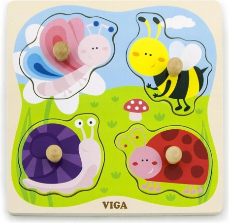 Das VIGA Holz-Einlegepuzzle mit 4 großen Teilen und Griffknöpfen ist das ideale erste Puzzle für die Kleinsten. Die farbenfrohen Motive von Insekten und Wiesentieren motivieren Kinder ganz natürlich zum Entdecken und Lernen. Gefräste Kanten auf der robusten Holzgrundplatte helfen, jedes Teil sicher an seinem Platz zu halten.