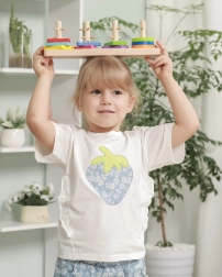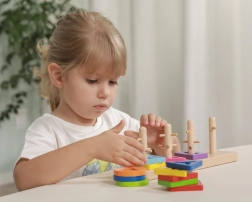 Durch das Zusammenstellen verschiedener Formen auf Holzstiften unterstützt das Spielzeug die Entwicklung der Feinmotorik und der Hand-Auge-Koordination.