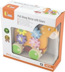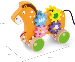 Das Pferd hat bunte Zahnräder, die sich beim Bewegen des Spielzeugs drehen und kleinen Kindern helfen, ihre motorischen Fähigkeiten zu entwickeln.