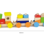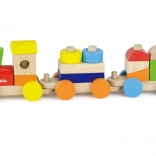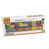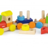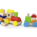 Beim Stapeln der bunten Klötze auf Lok und Waggons trainieren Kinder Griff, Koordination und Vorstellungskraft.