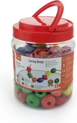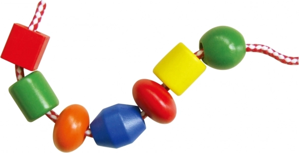 Kreatives Holzperlen Auffädelset für Kinder ab 3 Jahren. Enthält 90 Perlen und 5 Schnüre. Fördert Feinmotorik und Fantasie. Ideal für unterwegs.