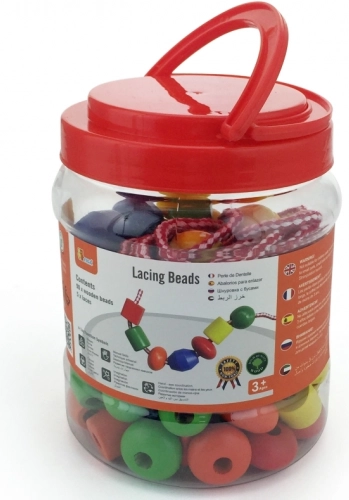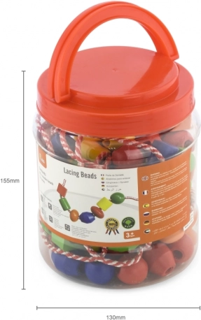 Die Kunststoffdose enthält große Holzkugeln und bunte Schnürsenkel, auf die die Kugeln aufgefädelt werden können. Größe der Perlen je nach Art ca. 2 x 2 cm. Verpackungsmaße ca. 16 x 12 cm. Enthält 90 Perlen und 5 Schnüre. Alter 3+.