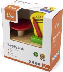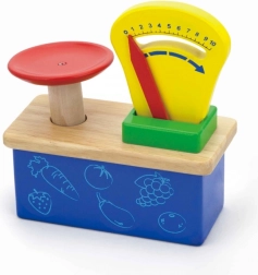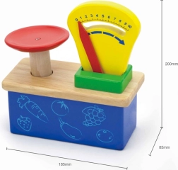 Die Waage hat praktische Maße von ca. 18,5 × 20 × 8,5 cm, liegt gut in der Hand und besteht aus einer Kombination aus Holz und robustem Kunststoff. Sie ist für Kinder ab 3 Jahren sicher und fördert Fantasie, Feinmotorik und soziale Fähigkeiten.