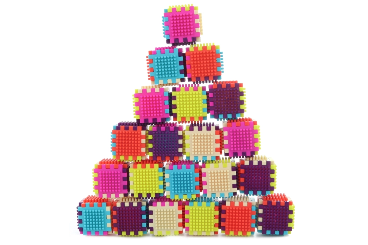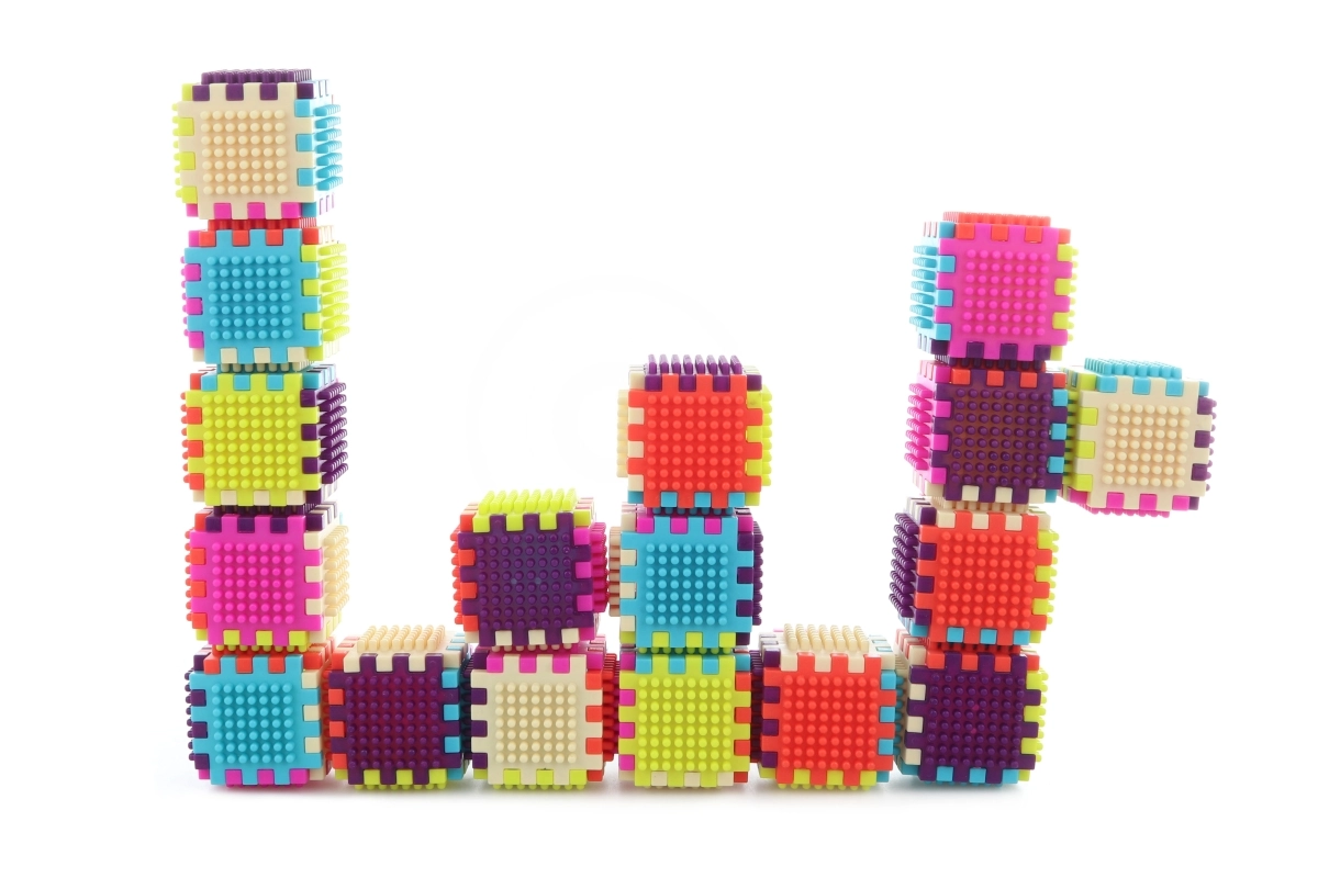 Leuchtende Farben und leicht miteinander verbindbare Steine inspirieren Kinder, Türme, Häuschen und fantasievolle Objekte zu erschaffen.