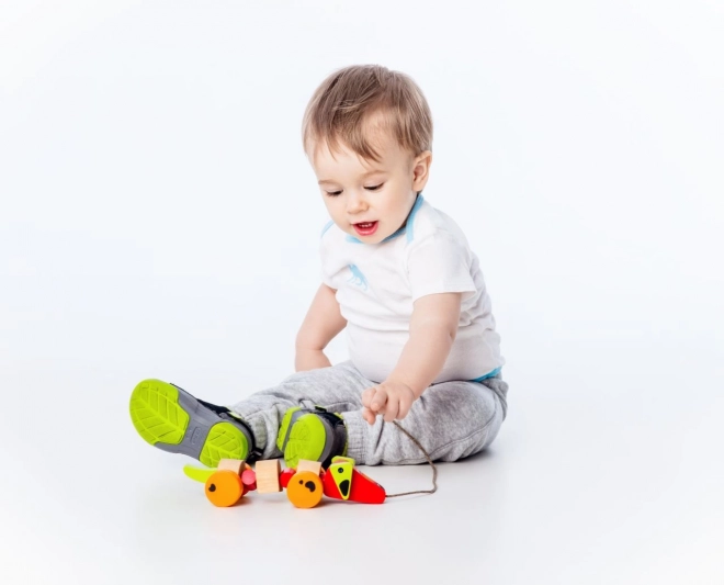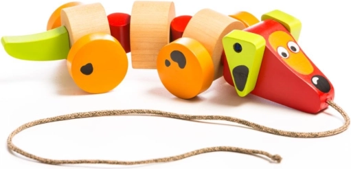 Holzdackel an der Leine, fröhliches Spielzeug zur Entwicklung der Motorik des Kindes. Farbigkeit und sichere Materialien für Kinder ab 18 Monaten.