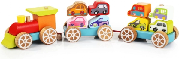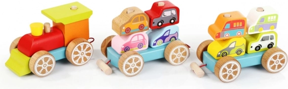 Dieses bunte Holzpuzzle enthält 14 Teile, aus denen Kinder einen Zug mit zwei Waggons und acht Autos zusammenbauen können. Sie spielen nicht nur mit den einzelnen Teilen, sondern entwickeln auch ihre senso-motorischen Fähigkeiten, logisches Denken und Kreativität.