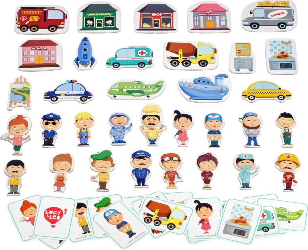 Entdecken Sie ein unterhaltsames und lehrreiches magnetisches Spiel in einem Holzkoffer, das Kindern hilft, verschiedene Berufe kennenzulernen. Das Set enthält 17 beidseitige Karten und 50 Teile mit Figuren und Fahrzeugen zum freien Kombinieren. Der Deckel des Koffers dient als beidseitige Tafel – weiß für Marker und schwarz für Kreide – für noch mehr Kreativität. Ein ideales Hilfsmittel zur Förderung der Feinmotorik, Fantasie und des logischen Denkens für Kinder ab 3 Jahren.