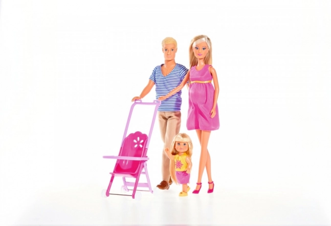 Das Steffi Happy Family Set enthält 3 Puppen: die schwangere Steffi, Kevin und die kleine Evi im Kinderwagen. Ebenfalls enthalten sind mehr als 19 Zubehörteile.