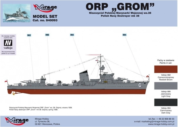 Dieses Bausatzmodell ist ideal für erfahrene Modellbauer, die eine originalgetreue Nachbildung des polnischen Zerstörers ORP 'Grom' aus dem Zweiten Weltkrieg anfertigen möchten. Im Maßstab 1:400 enthält das Modell detaillierte Teile und Zubehör, darunter: