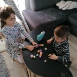 Kinder stapeln Holzzylinder auf eine schaukelnde Basis in Form eines Narwals und trainieren Feinmotorik, Koordination sowie das Einschätzungsvermögen. Jeder Zug ist eine Herausforderung, die Stabilität zu bewahren.