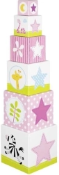 Das Set enthält 6 stabile Kartonwürfel, die zu einem hohen Turm gestapelt oder ineinander geschachtelt werden können. Jeder Würfel ist mit freundlichen Illustrationen von Tieren, Pflanzen und Zahlen verziert, sodass Kinder spielerisch grundlegende Fähigkeiten und Geduld entwickeln.
