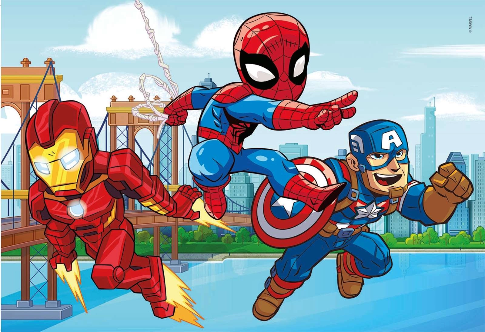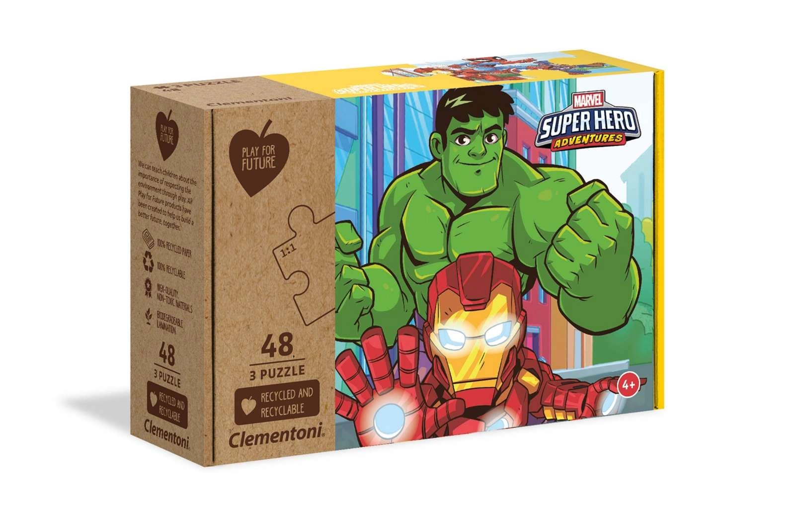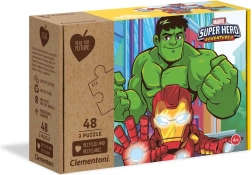 Kinderset mit drei Puzzles mit Motiven von MARVEL Super Hero Adventures, enthält 3 Bilder mit je 48 Teilen im Format 32 × 22 cm. Aus 100 % recycelten und recycelbaren Materialien hergestellt, fördert Beobachtungsgabe, logisches Denken und manuelle Fertigkeiten. Ideal für Kinder ab 4 Jahren und die ganze Familie.