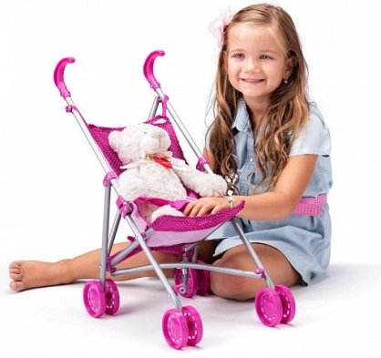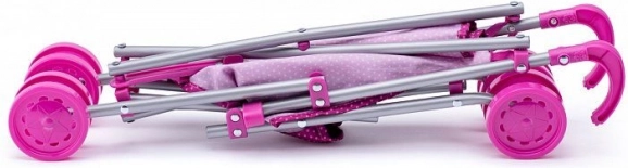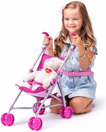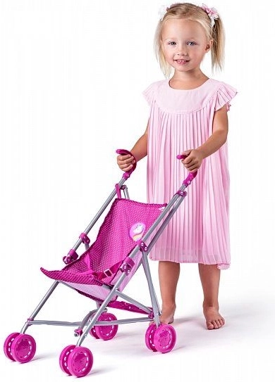 Der Wagen ist mit einem stabilen Metallrahmen und einem bequemen Stoffsitz ausgestattet. Kleine Mädchen können ihre Pflegefähigkeiten üben, während sie Spaß haben. Das klassische Design ermöglicht eine einfache Nutzung sowohl drinnen als auch draußen.
