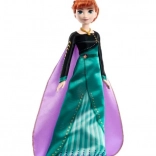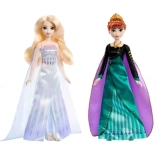 Anna in einem grün‑schwarzen Kleid mit purpurfarbenem Umhang und Elsa in einer weiß‑fliederfarbenen Robe mit transparentem Cape – detailreiche Drucke und Accessoires für authentisches Spiel.
