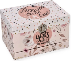 Im unteren Bereich befindet sich eine ausziehbare Schublade für zusätzlichen Stauraum, ein sicheres Metallschloss und eine robuste Verarbeitung aus leichtem Material, ideal fürs Kinderzimmer. Schriftzüge im Stil von „Girls rule the world“ und „Dreams come true“ verleihen einen verspielten Look und fördern die kreative Fantasie.