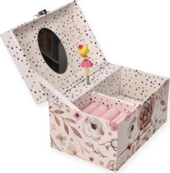 Dieses zarte rosa Schmuckkästchen mit Blumen- und Punktmuster birgt alles, was kleine Damen lieben: Beim Öffnen des Deckels erklingt eine Melodie und die Ballerina dreht sich auf der Spindel vor dem ovalen Spiegel. Innen erwartet Sie ein praktisch unterteilter Raum mit Ringkissen und Fächern für kleine Schätze.