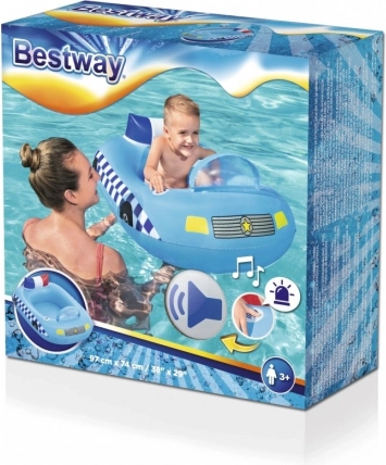Dieses blaue Kinderboot im Stil eines Polizeifahrzeugs verwandelt jedes Badeerlebnis in ein Abenteuer. Dank des integrierten Soundmoduls mit Sirene reicht ein Knopfdruck, und der kleine Fahrer ist sofort im Einsatz. Das robuste Vinylmaterial und die komfortable Rückenlehne sorgen für Stabilität und Bequemlichkeit.