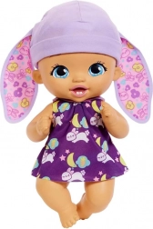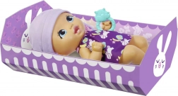 Die Puppe besteht aus robustem Kunststoff, hat markante blaue Augen, einen süßen Mund und eine lilafarbene Mütze mit Hasenohren. Ebenfalls enthalten ist ein Beißring, der die sensorische Entwicklung fördert. Die Verpackung unterstützt Nachhaltigkeit – nach dem Auspacken dient sie als praktische Wiege.