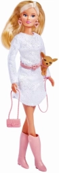 Die stylische Puppe STEFFI LOVE in einem glitzernden Kleid mit langen Ärmeln und Accessoires, darunter ein Herzgürtel und Herzohrringe, kommt mit einem niedlichen Hund Chihuahua an der Leine. Perfekt für kreatives Spielen, Mode-Umstylen und Rollenspiel-Szenen.