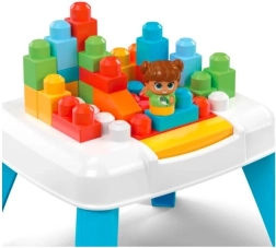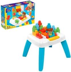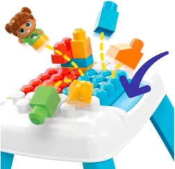 Dieser Tisch mit Einsturzfunktion ermöglicht das Bauen und mit einem Knopfdruck das Zerstreuen der Bausteine, was Kreativität und Spielspaß fördert.