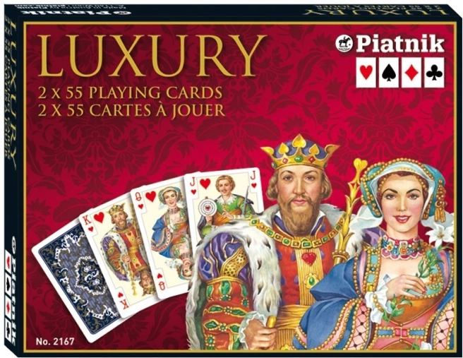 Entdecken Sie Eleganz und Qualität mit Luxuskarten vom renommierten Unternehmen Piatnik. Dieses Set enthält zwei einzigartige Decks, jedes mit 55 plastifizierten Karten, ein Gewicht von 310 g/m² und Abmessungen von 58 x 89 mm, ideal für verschiedene Kartenspiele.