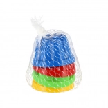 Buntes Set aus vier runden Sandformen mit 8 cm Durchmesser für kleine Sandkuchen-Baumeister. Geeignet ab 12 Monaten, aus robustem Kunststoff, in kräftigen Farben und praktisch im Netz verpackt für leichtes Tragen und Aufräumen.