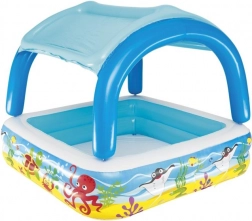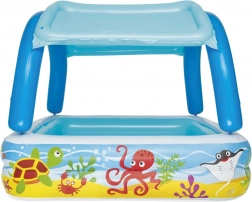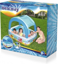Dieses aufblasbare Kinderbecken der Marke Bestway besteht aus langlebigem Vinylmaterial, das langanhaltenden Spaß und Sicherheit beim Spielen gewährleistet. Der Pool enthält zwei separate aufblasbare Ringe, die Stabilität und Sicherheit bieten, während der aufblasbare Baldachin die Kinder vor schädlichen Sonnenstrahlen schützt. Das Paket enthält auch ein wasserfestes Reperaturpflaster, mit dem der Pool auch im Wasser repariert werden kann.