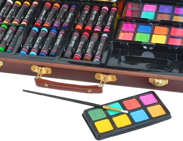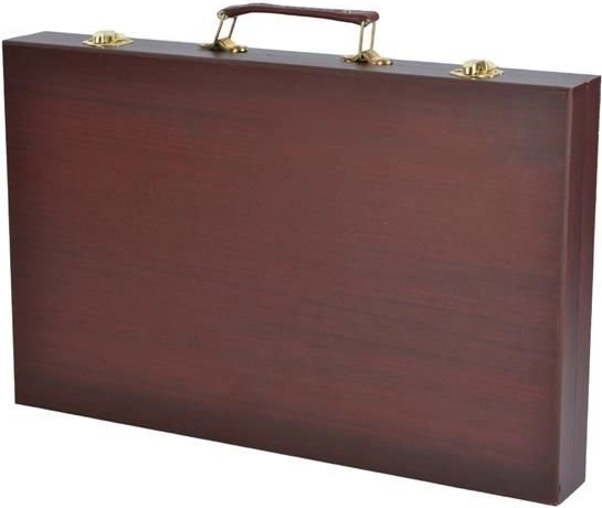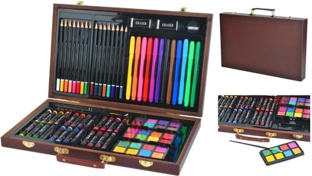 Alle Künstlermaterialien sind ordentlich in einem aufklappbaren Holzkoffer mit Fächern angeordnet, sodass Sie stets schnellen und einfachen Zugriff auf alles haben, was Sie benötigen.