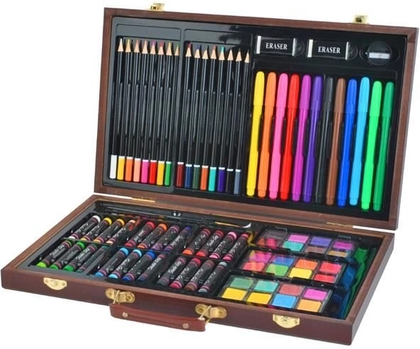 Das Set umfasst 24 Ölpastelle, 16 Buntstifte, 24 Aquarellfarben, 12 Filzstifte, 2 Pinsel, einen Anspitzer, 2 Radiergummis, einen Zeichenblock und ein Malbuch – bestens geeignet für Kinder ab 3 Jahren und Erwachsene. Hochwertige Materialien und eine breite Farbpalette ermöglichen kreative, originelle Werke zu Hause, in der Schule und im Freien.
