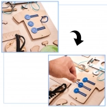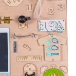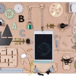 Das Brett enthält verschiedene interaktive Elemente wie Schalter, Reißverschlüsse und andere Kleinigkeiten, die Kinder sicher nutzen können, um zu lernen und Spaß zu haben.