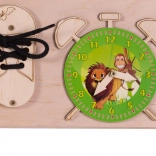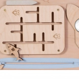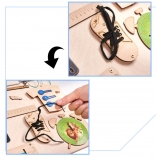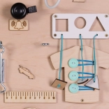 Das Spiel auf dem Brett fördert die Feinmotorik und die Hand-Auge-Koordination durch verschiedene Bewegungsaufgaben wie Schnürung oder Radmanipulation.