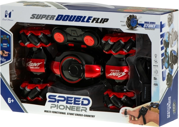 Steuern Sie das Auto mit Ihrer Handbewegung. Ein Armband mit Gyrosensor überträgt Ihre Gesten in Echtzeit über 2,4 GHz für eine intuitive und spaßige Fahrt.