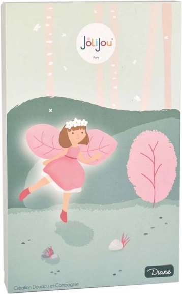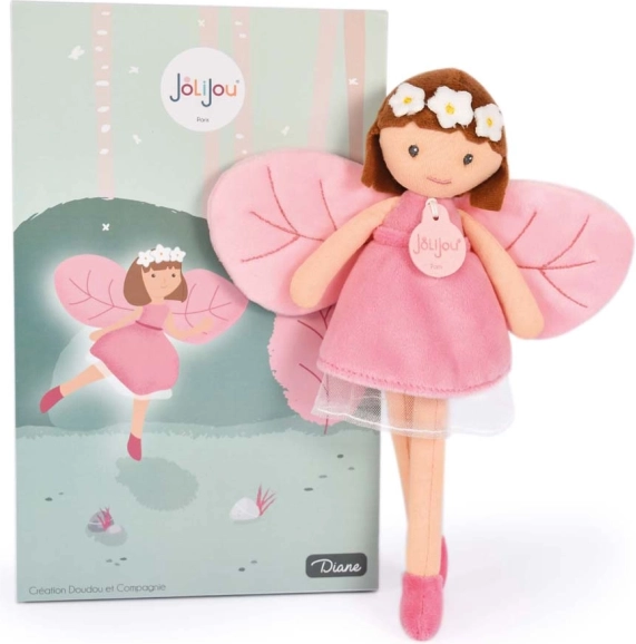 Die entzückende Puppe Diana der Marke Doudou Jolijou begeistert kleine Träumer schon ab der Geburt. Sie hat einen butterweichen Textilkörper, aufgestickte Augen und einen Mund für maximale Sicherheit und trägt ein rosafarbenes Kleid mit blattförmigen Flügeln. Inklusive Geschenkbox mit Waldmotiv – ideal als Geschenk.