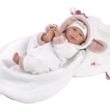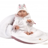 Sprechendes Baby mit weichem Stoffkörper, das beim Drücken auf die Brust „Mama“, „Papa“ sagt und realistische Baby-Weinlaute von sich gibt. Arme und Beine sind gelenkig am Körper befestigt. Das Baby ist positionierbar und kann auch sitzen. Der im Set enthaltene Schnuller dient nur als Zubehör. Größe 42 cm. Handgefertigt in Spanien, verpackt in einer Geschenkbox. Empfohlenes Alter ab 3 Jahren. Für das Baby kann zusätzlich originale Kleidung aus dem Llorens-Sortiment für NEW BORN in den Größen 40–42 cm oder 43–45 cm dazugekauft werden. Im Lieferumfang enthalten sind 3 x Knopfzellenbatterien LR44 mit Anleitung zum Batteriewechsel. Batterien sind Verbrauchsmaterial, daher stellt ihre Entladung keinen Reklamationsgrund für die Puppe dar.
