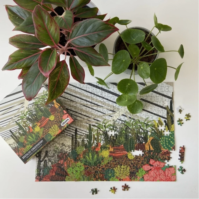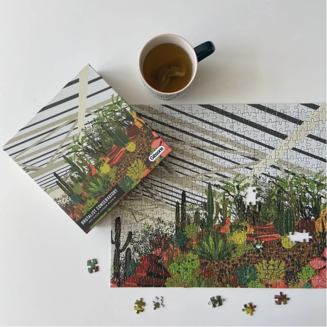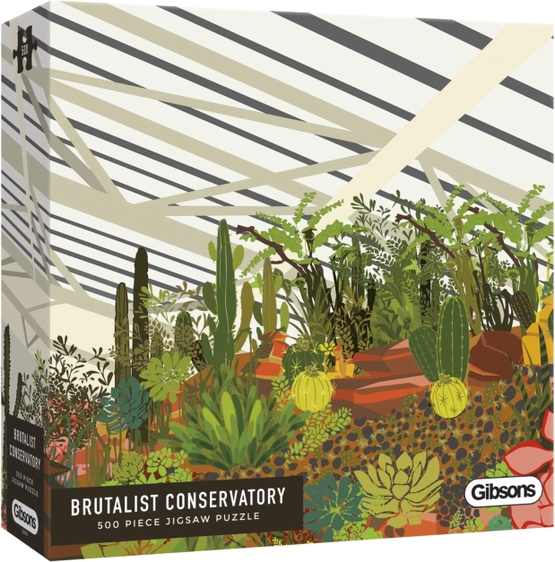 Discover the magic of the urban jungle with a puzzle by GIBSONS. The illustration captures the winter garden at London’s Barbican with tropical plants, deciduous foliage, and cacti. Assembling the 500 pieces offers a relaxing experience, quality craftsmanship, and a reference poster included for easier puzzling.