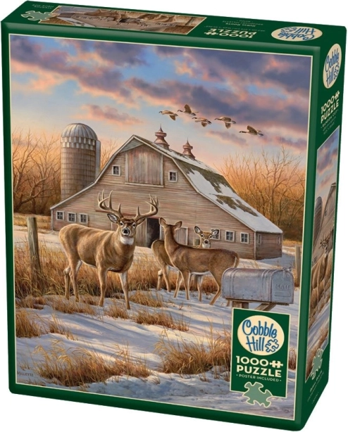 Discover the charm of a winter landscape with deer, a barn, and flying geese—the detailed illustration creates a striking motif that nature and countryside enthusiasts will love. COBBLE HILL puzzles are known for their precise quality and unique die-cut, delivering a one-of-a-kind puzzling experience.