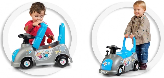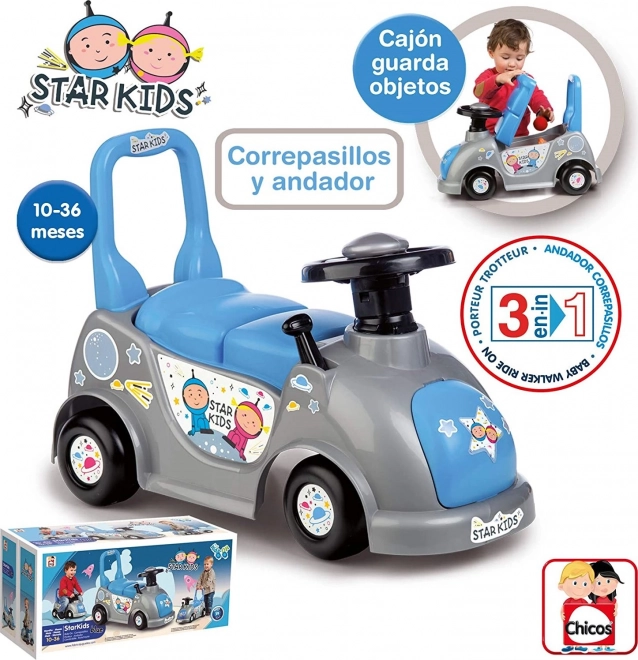 Discover the versatile CHICOS Star Kids 3-in-1 balance ride-on in a playful blue-gray design with space motifs. It serves as a walker for first steps, then as a ride-on to develop coordination, and also offers a storage compartment for small items under the seat. High-quality, durable plastic and a thoughtful construction ensure comfortable and safe everyday use.