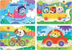 This set includes four separate puzzles measuring 24 x 16 cm with different numbers of pieces (from 5 to 8), which gradually improve the child's assembling skills and increase difficulty. Each puzzle allows the independent removal and assembly of an entire vehicle, supporting the development of motor skills and logical thinking in children.