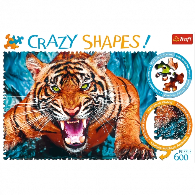 Discover Puzzle Crazy Shapes, a revolutionary series that brings pieces with unconventional shapes, no straight edges, and irregular borders. Once assembled, it forms a picture with dimensions of 680 x 480 mm, depicting an impressive tiger.