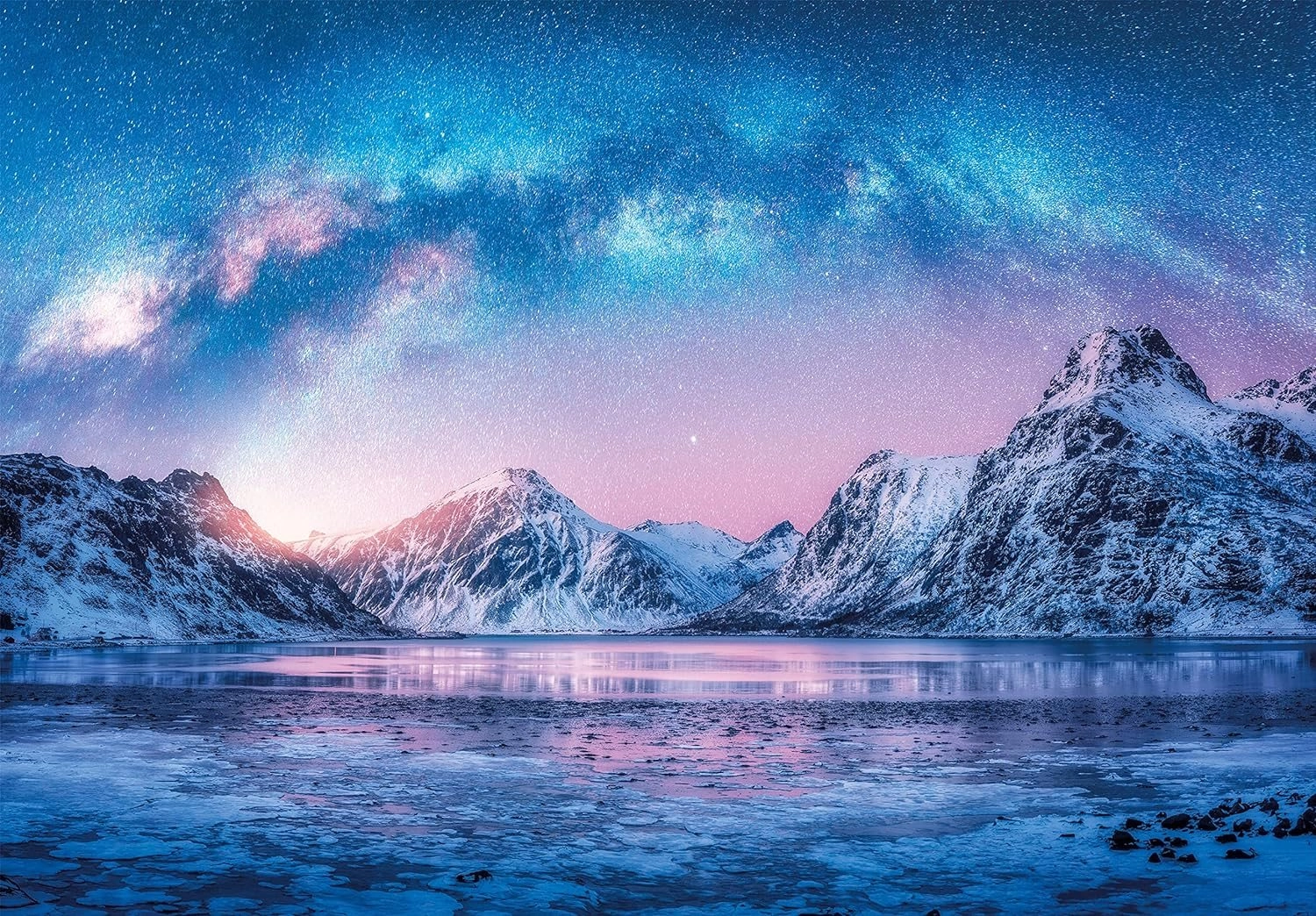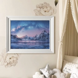A landscape with mountains, a lake, and a starry sky supports focus and inner peace while you puzzle.