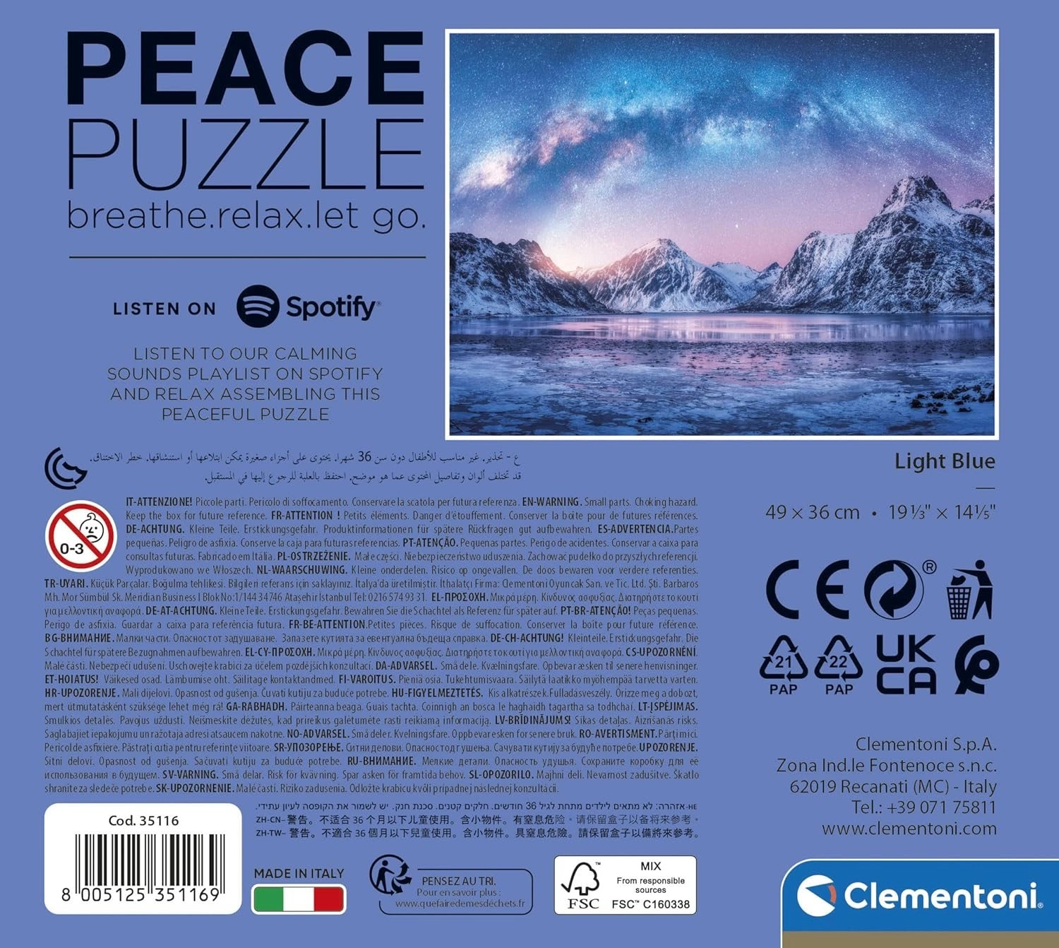 Enjoy moments of peace with the CLEMENTONI Peace Collection Light Blue puzzle. Premium pieces made from high-quality, thick cardboard fit perfectly, and the motif of a serene Nordic landscape with a shimmering sky creates the ideal mood for meditative puzzling.