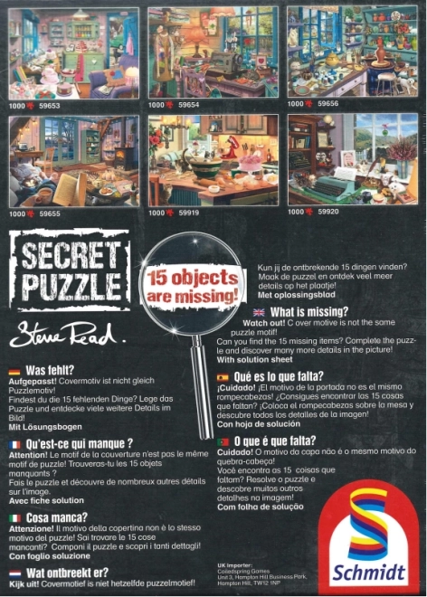 Bring your concentration and detective skills to the limit with the Secret Collection puzzle by Schmidt. This unique puzzle presents 15 differences that you will only find during assembly. What you see on the box is not what you get on the board. It's time to explore each piece and reveal the hidden truth!