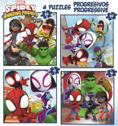 The progressive puzzle set SPIDEY and His Amazing Friends 4-in-1 brings kids the joy of assembling while subtly teaching focus and patience. Four different jigsaws with 12, 16, 20, and 25 pieces allow a smooth transition to more challenging images and support the development of logical thinking.