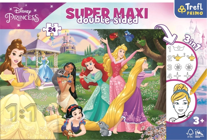 The Double-Sided Super Maxi puzzle brings kids double the fun. One side offers a colorful DISNEY PRINCESS scene and 24 large pieces that are easy for small hands to put together. The other side serves as a coloring page and a simple counting activity that supports logical thinking and hand–eye coordination.