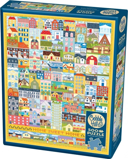 Enjoy assembling the 500-piece COBBLE HILL Home, Sweet Home puzzle. Thanks to its irregular die-cut, it offers a greater challenge and unique piece shapes. The box includes a 30.5 × 22.9 cm reference poster; the finished puzzle measures 48.9 × 67.6 cm.