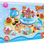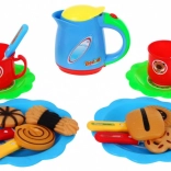 A teapot, cups with saucers, plates, and sweets let children serve just like at a real party.