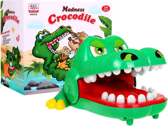 | The crocodile boldly opens its jaws and we see a row of beautiful, straight teeth, but unfortunately one of them hurts. Press your finger down on any tooth in turn (with multiple players, take turns). 3 GAME VARIANTS: 1. SORE TOOTH - red button - activates the first game mode. - after pressing it, start the game: press one tooth after another... If you hit the sore tooth, the crocodile will bite you! That means you lose. 2. REFLEX GAME: - press the tooth that lights up orange, - quickly press the teeth that light up one after another; the lighting speed will increase, - if two teeth light up at the same time, try to press them as fast as possible one after the other, - if you press incorrectly three times, the crocodile closes its jaws, you lose, the game ends. - at the end of the game, the number of lit teeth will correspond to your reflex level. 3) MEMORY: - press the green-lit tooth, - memorize the lit teeth, - when the crocodile asks "Which tooth hurts?", press the teeth you memorized, - you can try again if your answer is correct, - the number of lit teeth will increase and their lighting time will keep getting shorter. - if you answer incorrectly, the crocodile’s jaws will close and bite your finger. | ||