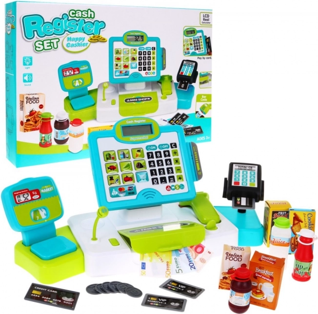The set includes many accessories, such as imitation food products and cards (VIP and credit cards), which enrich children's imagination and allow them to play the role of a seller in a shop.