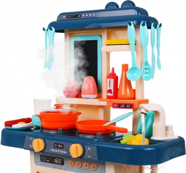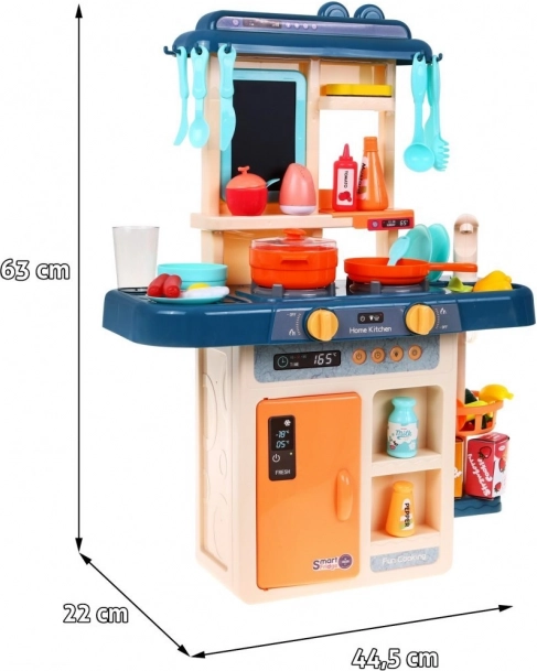 It includes a functional sink with faucet that can be filled with water, an opening refrigerator, practical shelves, and a chalkboard above the stove where kids can write their recipes or lists. The entire set contains 42 elements including cookware, food, and kitchen accessories. The toy is powered by 3× AA batteries (not included) and has CE certification.